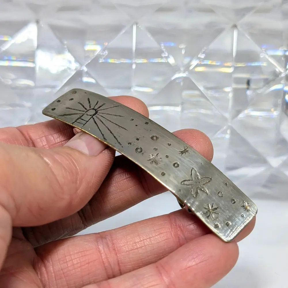 LA BARRETTE ARGENTÉE NAÏVE est gravée de charmants motifs marins. C’est un petit bijou pour briller dans vos cheveux. C’est une pièce unique !