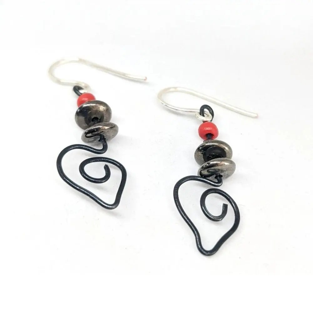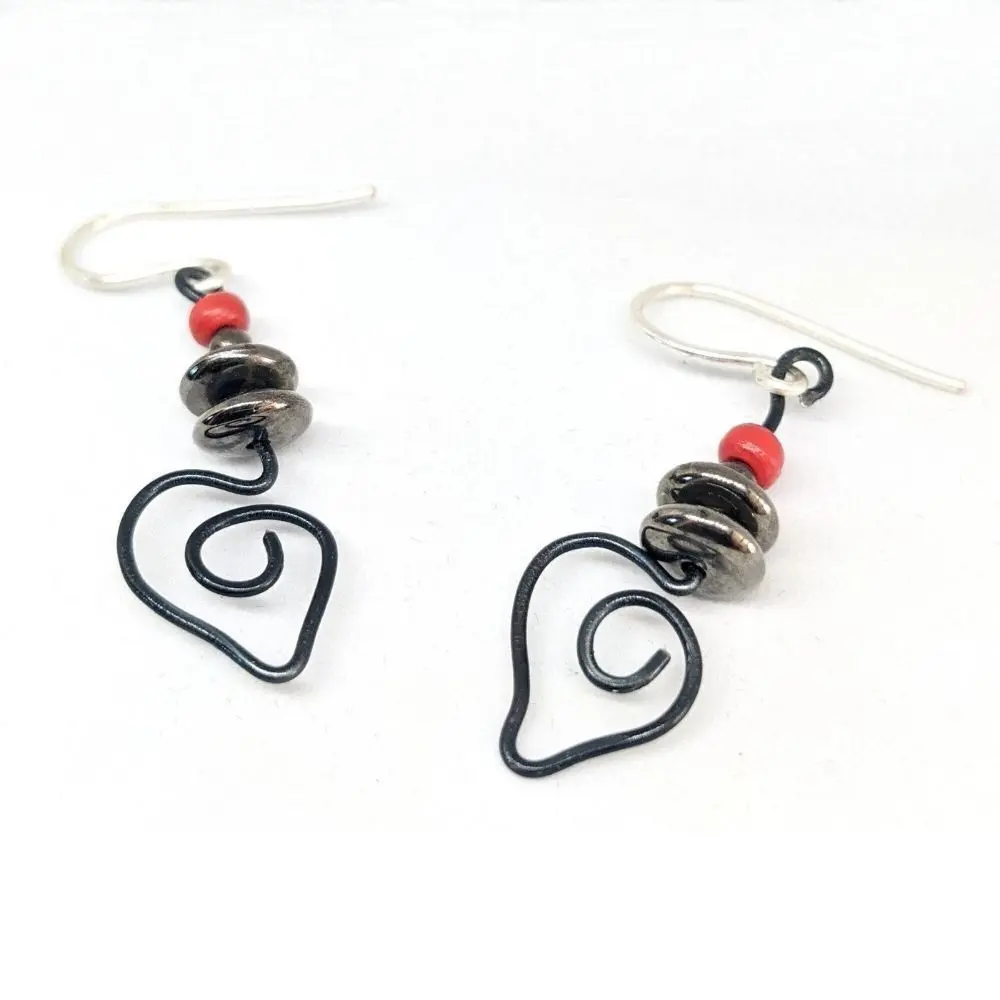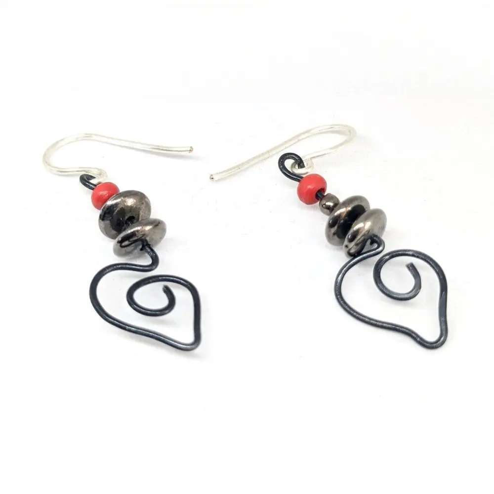 - Matériaux : Crochets d’oreilles plaqués argent, cuivre, bois, fil d’aluminium, acier.