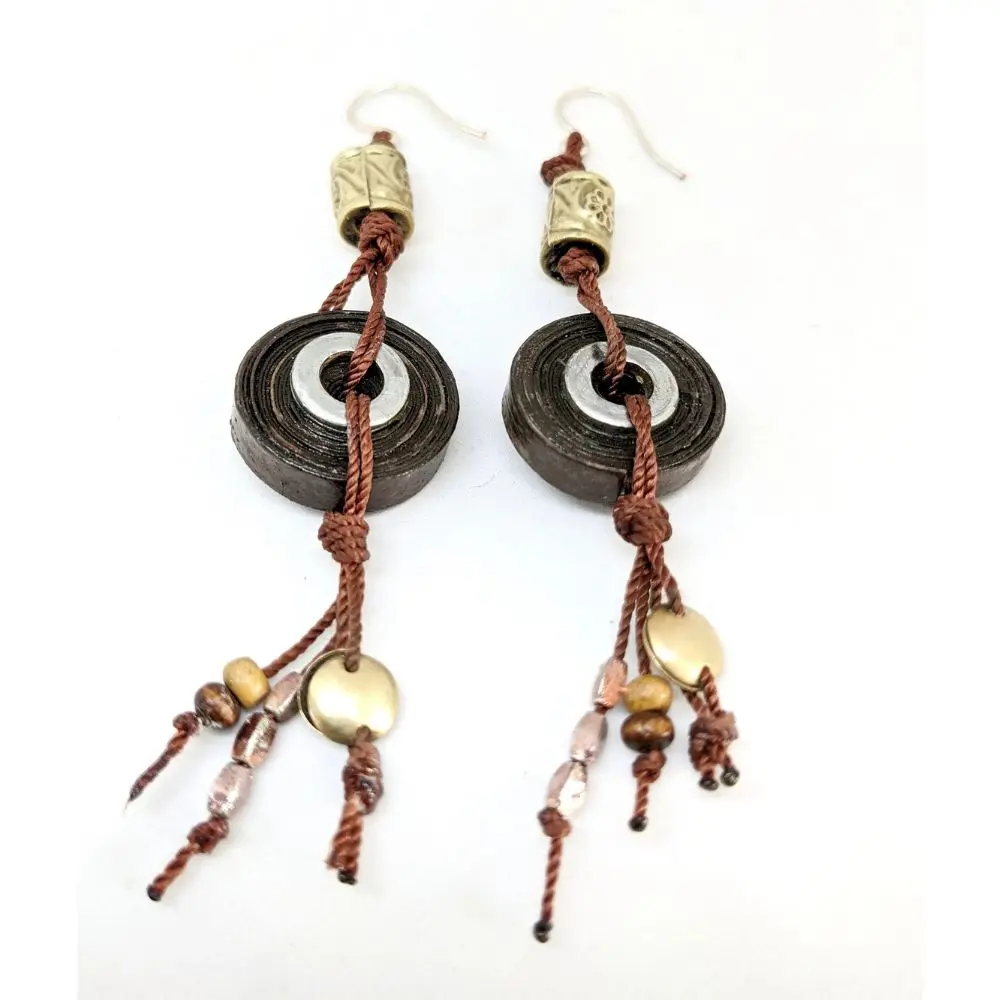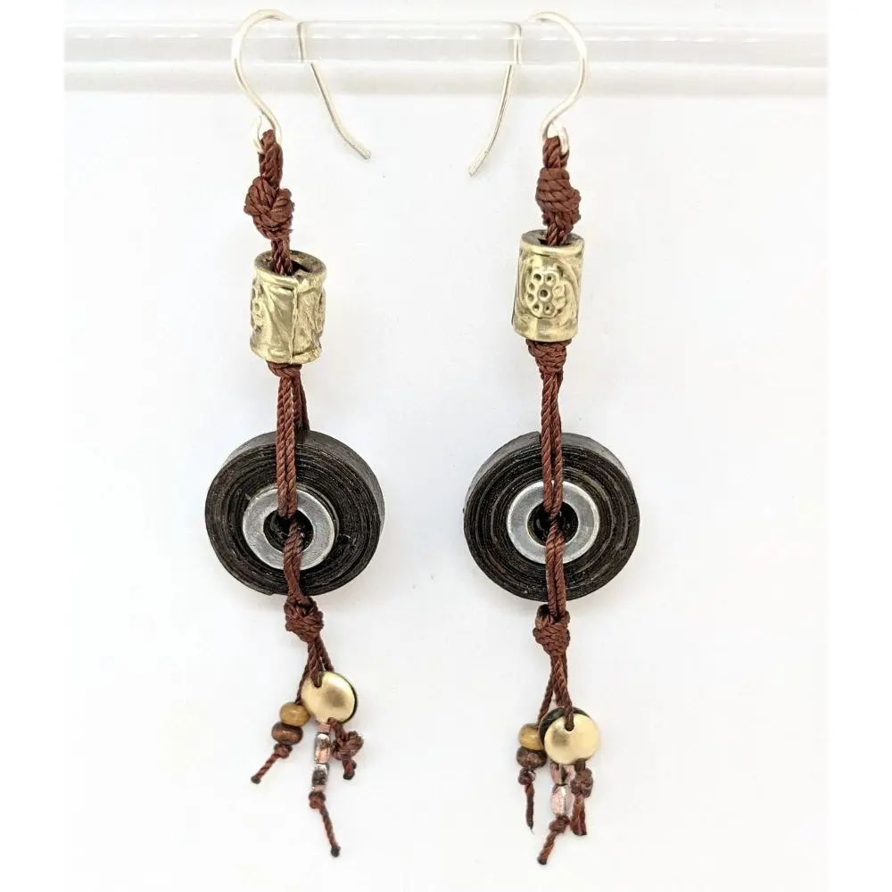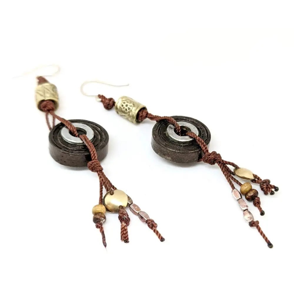 - Matériaux : Crochets d’oreilles plaqués argent, cuivre, fils, perles de papier, de bois, de laiton et d’acier.
