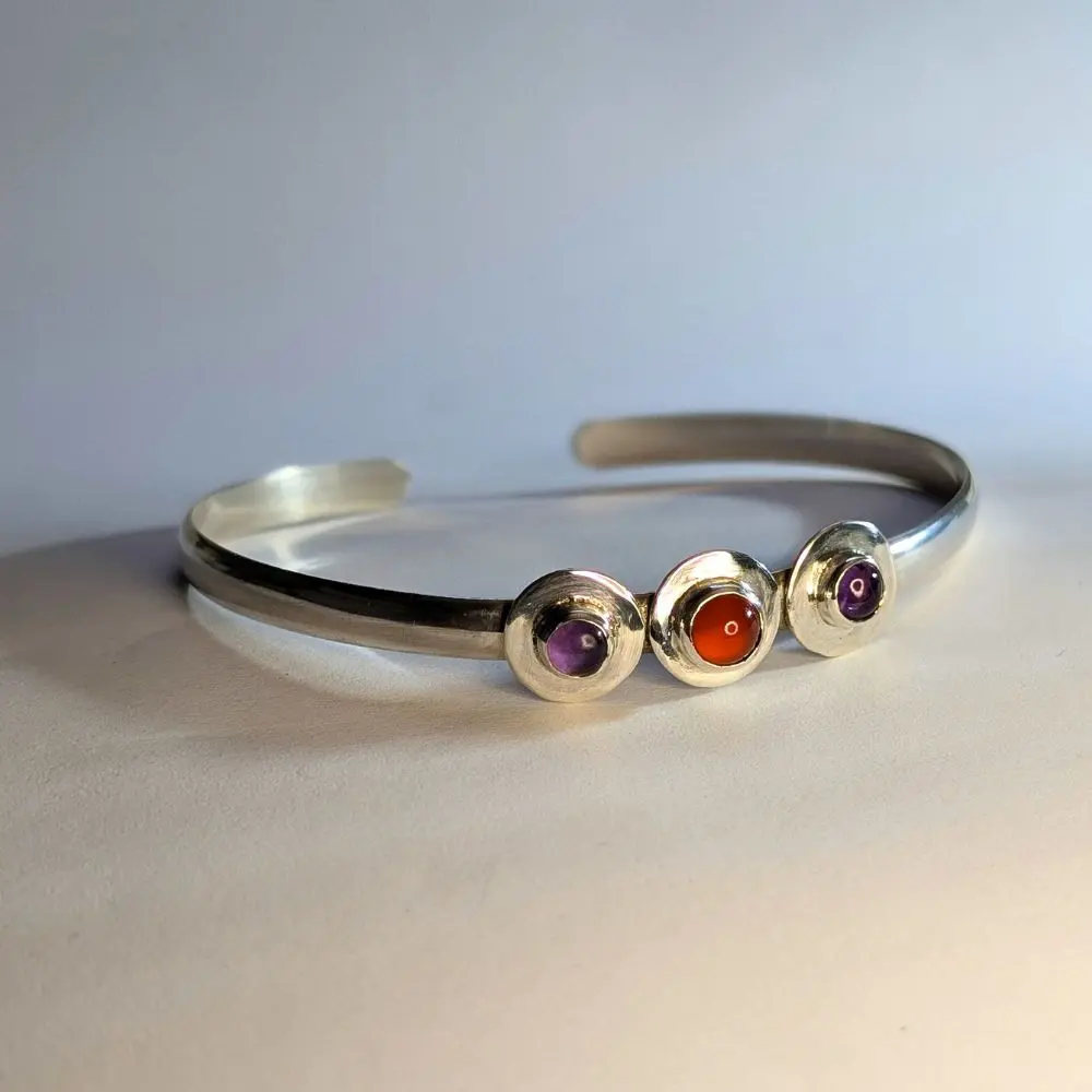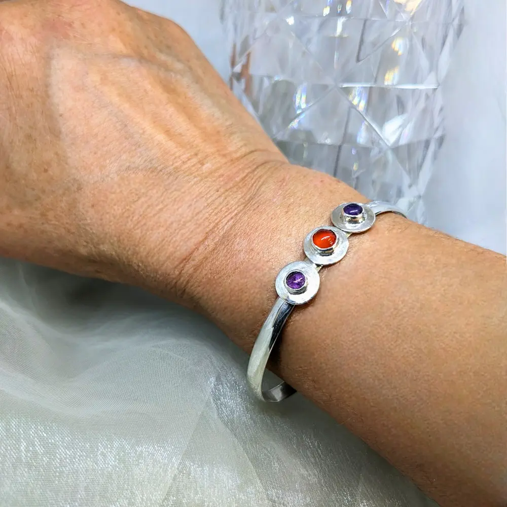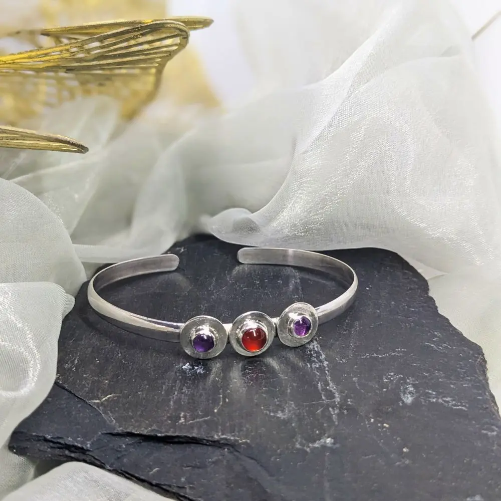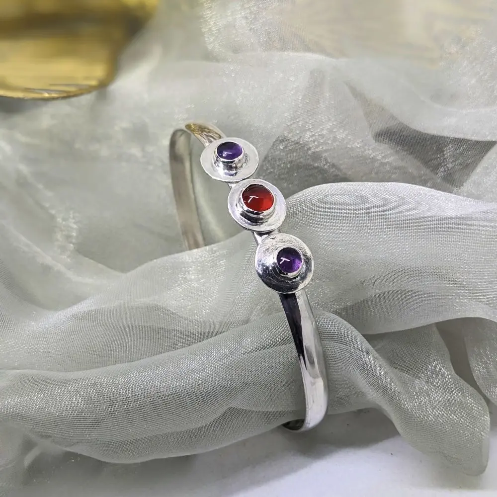LE JONC TROIS PIERRES en argent a deux améthystes et une cornaline. Offrez-vous un bijou raffiné. C’est un superbe modèle plein d’élégance et de classe.