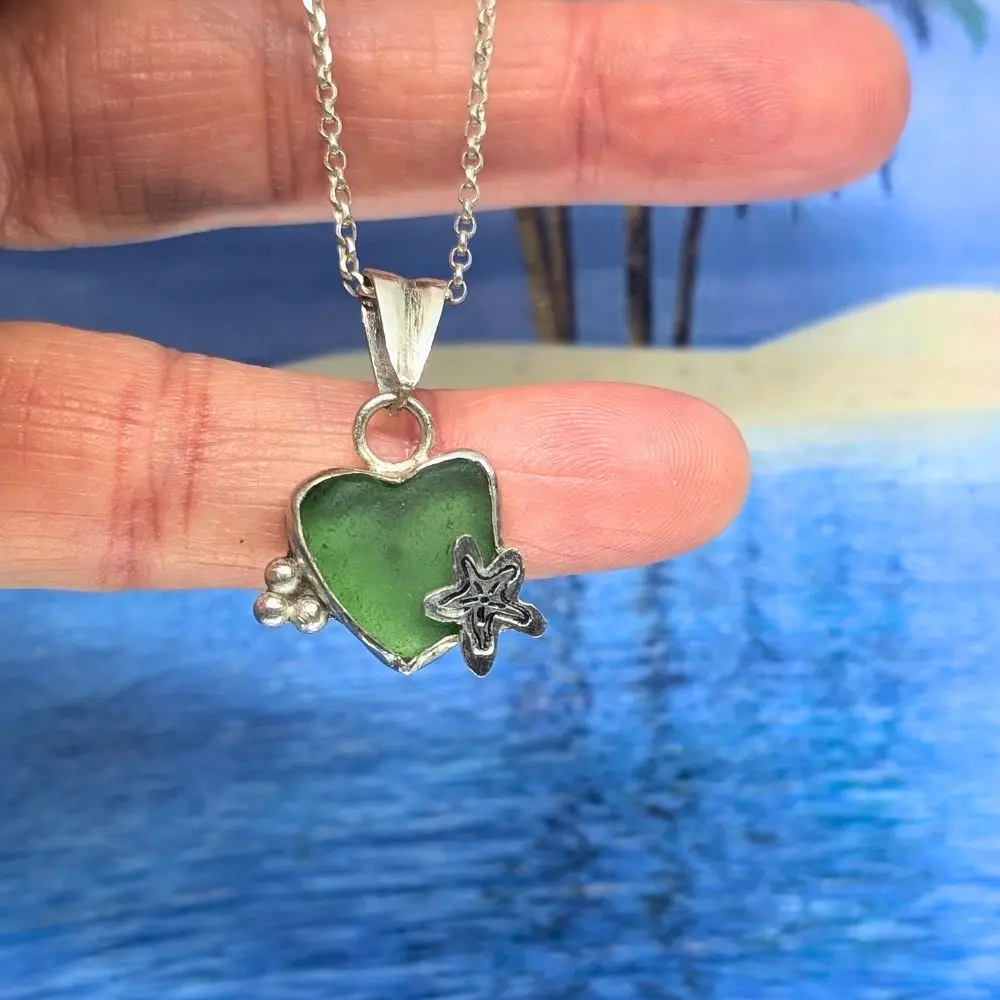 LE COLLIER ÉTOILE DE MER ET VERRE POLI en argent 925 vient de la mer Méditerranée. C’est une invitation au voyage et à la rêverie. Emportez la plage avec vous. Offrez ou offrez-vous cet adorable cœur.