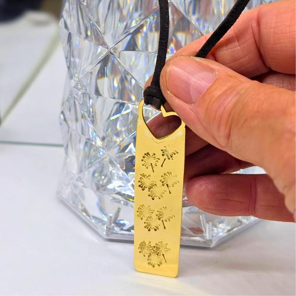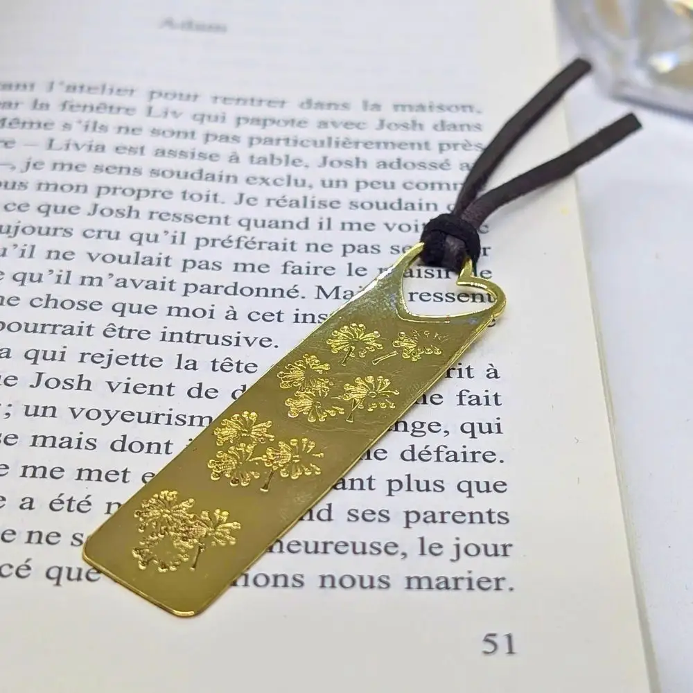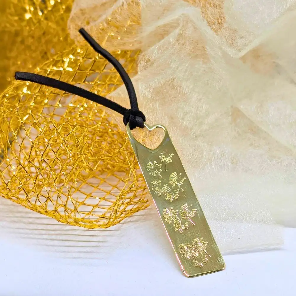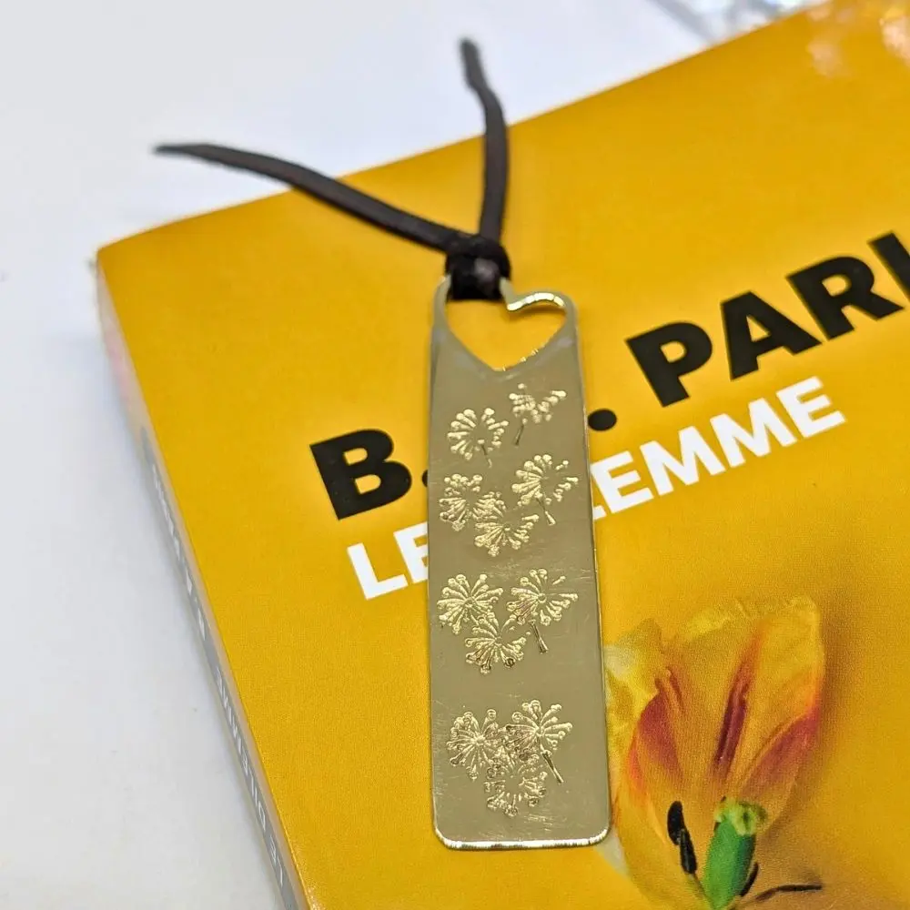 💫 Ce petit marque-page est un accessoire de lecture raffiné. Il a une belle couleur or et d’adorables dents de lion gravées. Le tout orné d’un cœur et d’un lacet en cuir de daim brun. Je l’ai entièrement fait main. C’est un cadeau parfait.